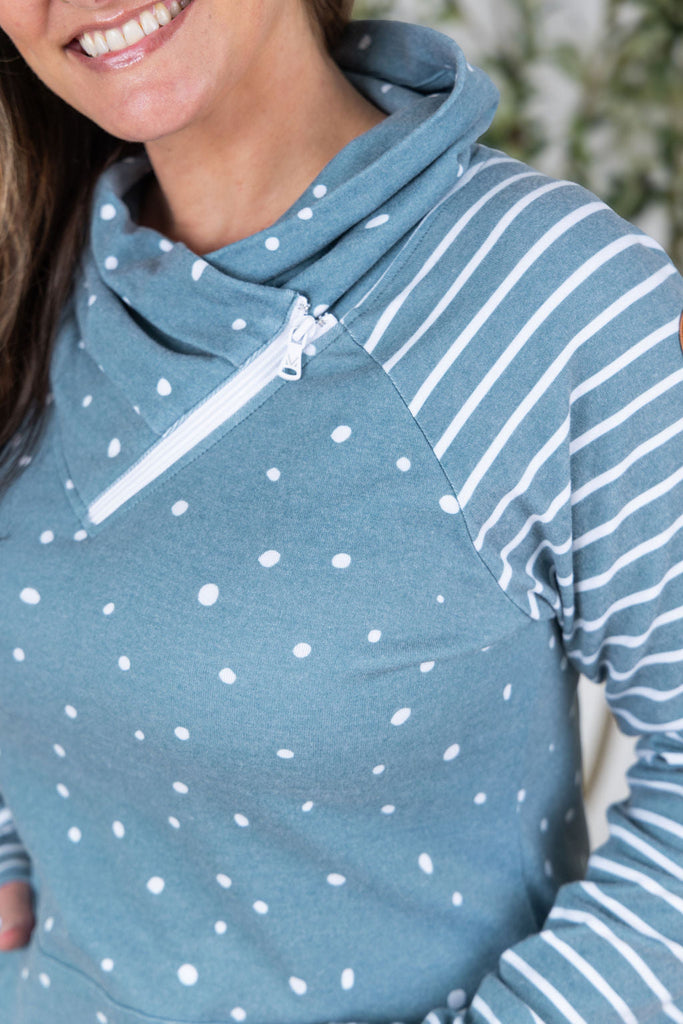 IN STOCK Zoey ZipCowl Sweatshirt - Teal Dots and Stripes